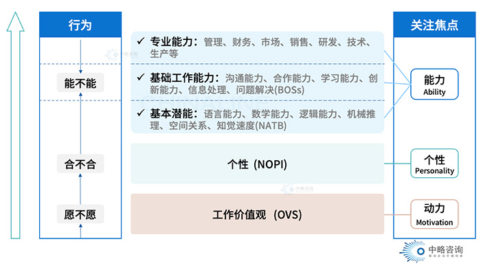 4. 通過分析“標準樣本”數據,提煉目標崗位的“勝任能力(全員核心勝任能力、序列通用勝任能力和序列專業勝任能力)要項”:能力(專業能力、基礎工作能力BOSs和基本潛能NATB)、個性(NOPI)、動力(工作價值觀OVS)。